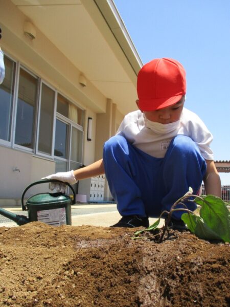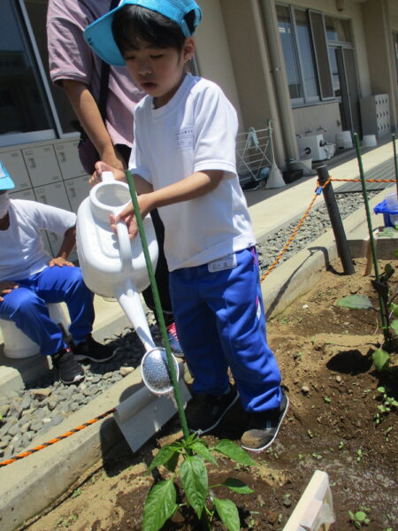 暑い夏を迎え、小学部の学級園では児童が植えた野菜や花がすくすく育っています。ピーマンやナスなどの夏野菜は、収穫も始まっています!みんなは暑さにも負けず、大きく元気に育つように水やりを頑張っています。