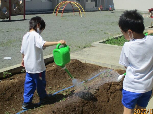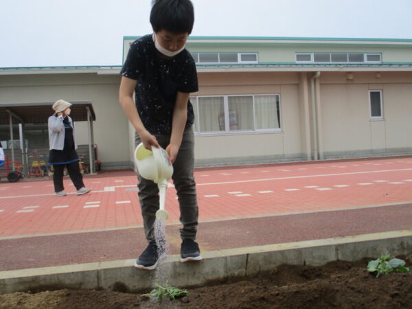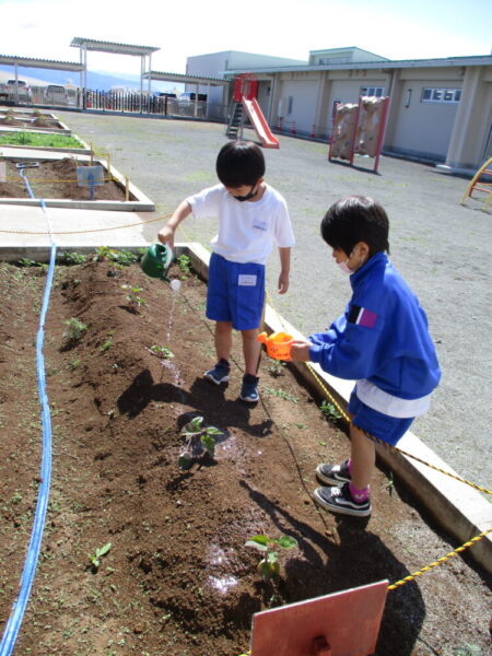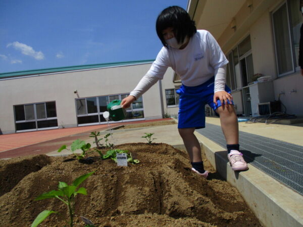 山梨県立わかば支援学校 > 活動のようす > 小学部 > おおきくなあれ 2022年7月6日カテゴリー: 小学部 活動のようす おおきくなあれ 暑い夏を迎え、小学部の学級園では児童が植えた野菜や花がすくすく育っています。ピーマンやナスなどの夏野菜は、収穫も始まっています!みんなは暑さにも負けず、大きく元気に育つように水やりを頑張っています。