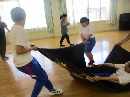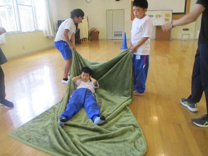 山梨県立わかば支援学校 > 活動のようす > 小学部 > 【小学部6年生】分校との合同学習 2023年7月7日カテゴリー: 小学部 活動のようす 【小学部6年生】分校との合同学習 7月3日に小学部6年生が、ふじかわ分校の6年生と合同学習を行いました。 久しぶりの再会に少し緊張しましたが、ゲームが始まると和気あいあいと楽しむことができました。特に、布団に乗ったお友だちを協力して引っ張る『魔法のじゅうたん』ゲームは大盛り上がりでした。2学期にまた一緒に勉強できるのがとても楽しみです。
