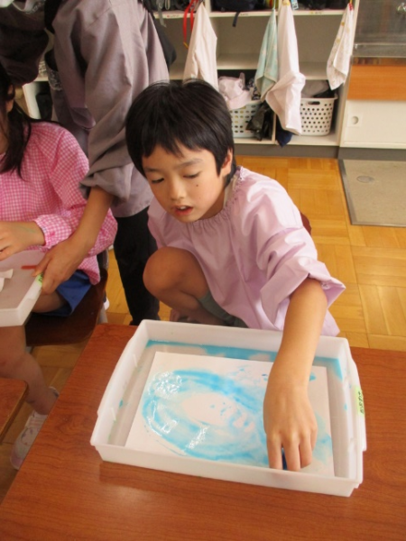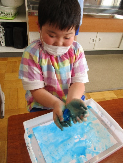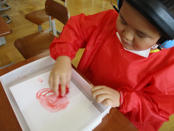 まだまだ暑さが続く9月。小学部2年生は色氷を紙の上に滑らせて、作品作りを行いました。氷で手が冷たいことも気にせず、夢中で紙の上を滑らせます。2色の氷を滑らせて、色が混ざる様子を楽しむ子もいました。暑い午後にひんやり涼しく、とても楽しい時間でした。