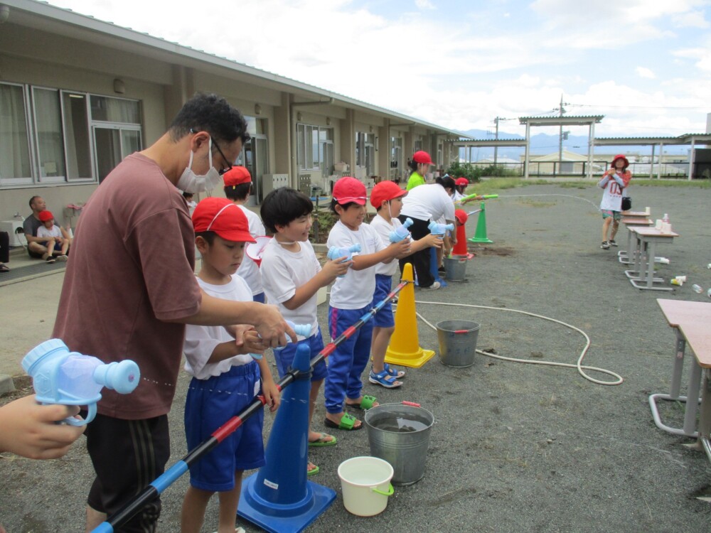 山梨県立わかば支援学校 > 活動のようす > 小学部 > 【小学部3年】生活(遊びの指導)授業の様子 2024年9月24日カテゴリー: 小学部 活動のようす 【小学部3年】生活(遊びの指導)授業の様子 小学部3年生では、『遊びの指導』の授業で、季節の学習をしました。夏は暑いということを確認した後、夏の遊び、水鉄砲で盛り上がりました。自分で作った紙コップの的に向かって、勢いよく水を噴射します。2グループずつ前に出て挑戦。どちらのグループが早く的を落とせるか競います。「決められた線からは出ない」「人に向けない」等のルールをしっかり守って楽しく遊ぶことができました。