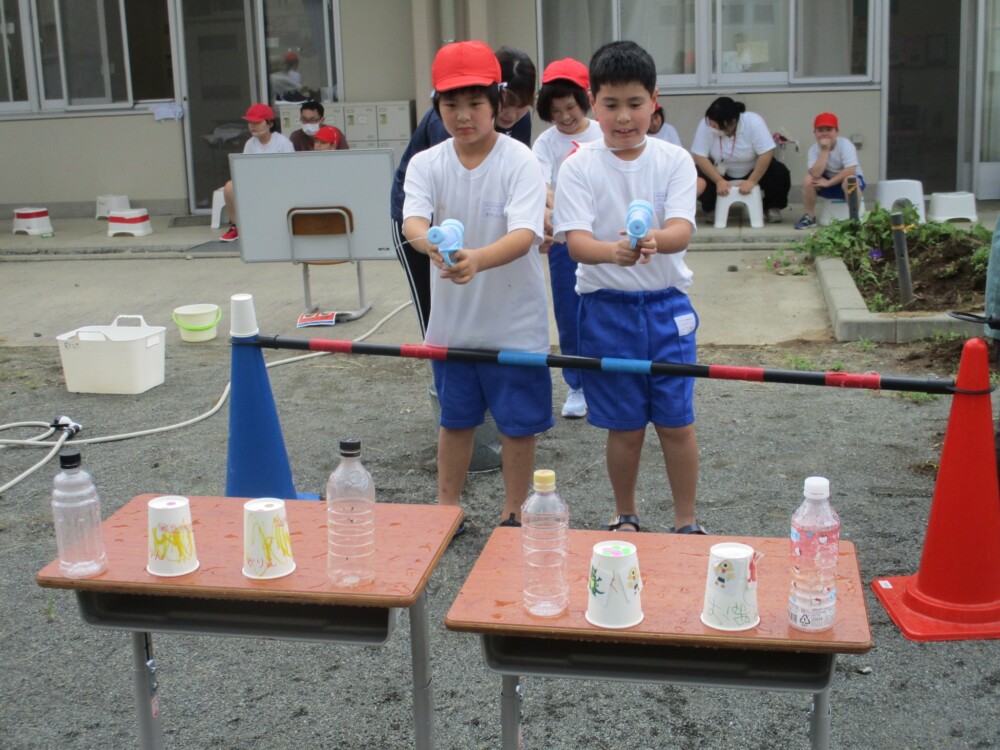小学部3年生では、『遊びの指導』の授業で、季節の学習をしました。夏は暑いということを確認した後、夏の遊び、水鉄砲で盛り上がりました。自分で作った紙コップの的に向かって、勢いよく水を噴射します。2グループずつ前に出て挑戦。どちらのグループが早く的を落とせるか競います。「決められた線からは出ない」「人に向けない」等のルールをしっかり守って楽しく遊ぶことができました。