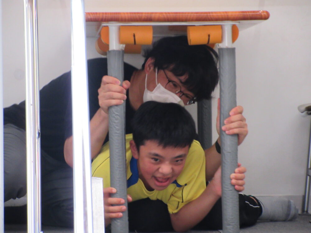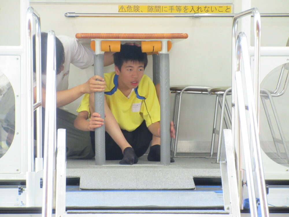 山梨県立わかば支援学校 > 活動のようす > 中学部 > 【中学部】2年生 起震車体験 2025年7月3日カテゴリー: 中学部 活動のようす 【中学部】2年生 起震車体験 6月18日(水)に、起震車体験をしました。震度4から震度6強の揺れを体験しました。はじめて経験する揺れに生徒たちは驚いたり怖がったりしていましたが、机の下にもぐる、頭を守るといった「自分の命は自分で守る」行動を行うことができました。また、煙体験も行い、ハンカチで口元を押さえながら、出口まで煙の中を歩いていくことができました。防災への意識が高まったとともに、災害時に自分の命を守る行動について考える貴重な機会となりました。